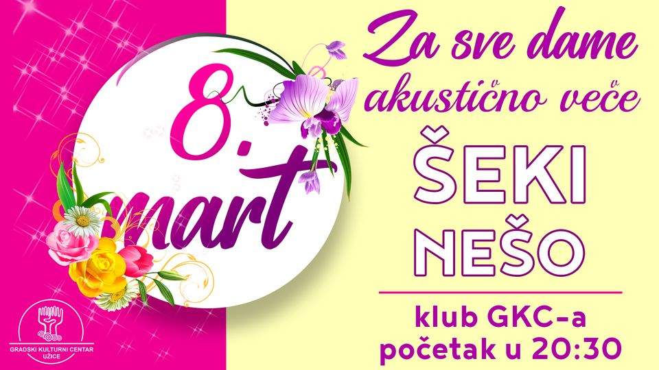 Поводом 8. марта, Међународног дана жена, Градски културни центар свим припадницама лепшег пола поклања акустично вече посвећено њима. Гитарски акустични дуо Драган Илић Шеки и Ненад Миливојевић Нешо наступиће у клубу ГКЦ-а са почетком од 20,30 часова. Улаз је слободан.