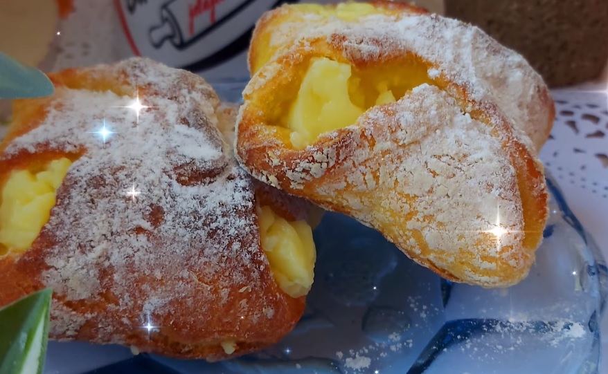 Лагано га обрадити и оклагијом развући тање, па изрезати квадратиће. У сваки квадратић ставити кашику скуваног пудинга од ваниле. Савити углове на средини као пакетић. Ређати у плех обложен пек папиром.