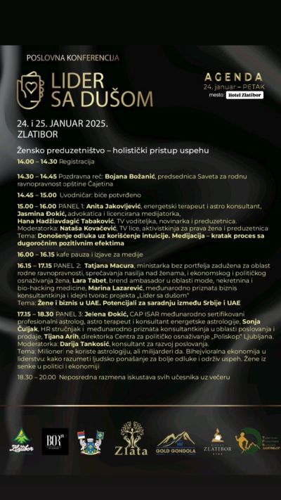 Општина Чајетина с поносом најављује пословну конференцију „Лидер са душом“, која ће се одржати 24. и 25. јануара 2025. године на Златибору, у престижним хотелима Златибор и Бор. Овај јединствени догађај окупиће водеће привреднике, стручњаке и предузетнике из Србије и иностранства, с циљем унапређења пословних веза и истраживања кључних трендова у модерном пословању.
