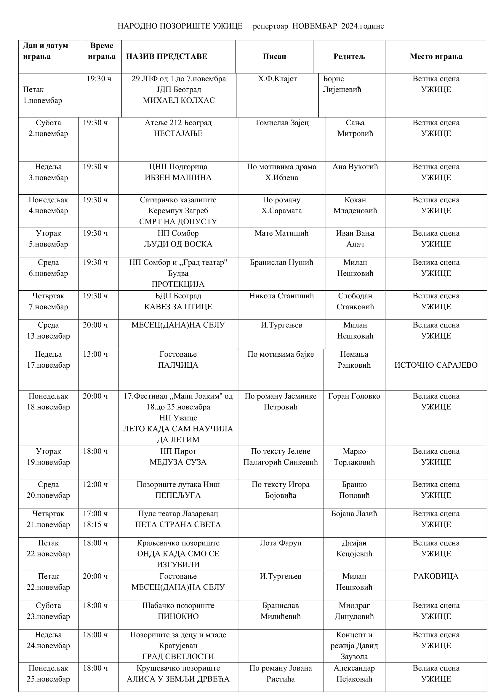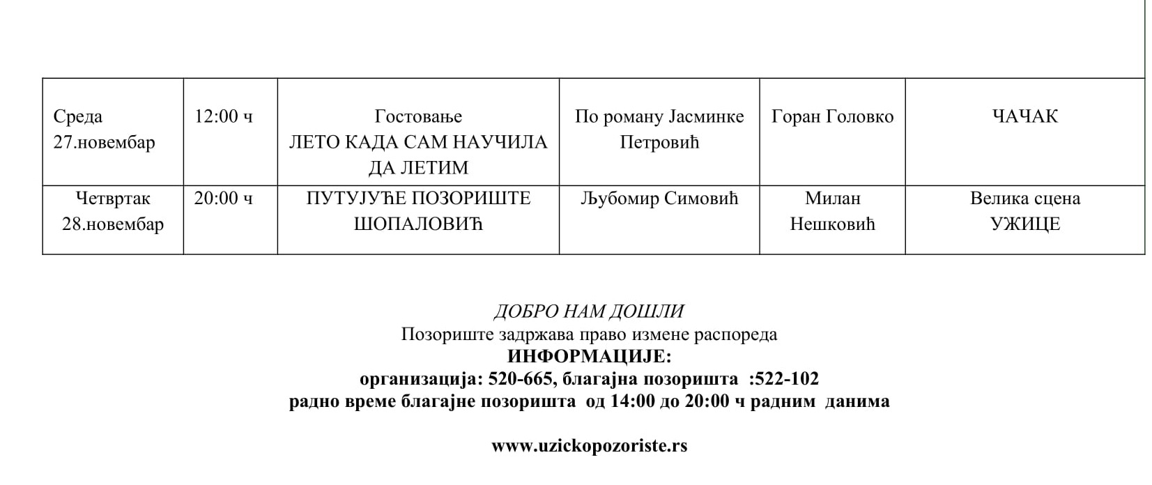 УЖИЧКЕ ВЕСТИ ФОТО РАЗГЛЕДНИЦАРепертоар Народног позоришта Ужице за новембар октобар 26, 20240969 Komentari